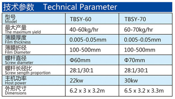 吹制各種規(guī)格的低密度聚乙烯、高密度聚乙烯和線性低密度聚乙烯塑料薄膜,廣泛應(yīng)用于食品百貨、日用、化工、針紡品、購(gòu)物禮袋和工業(yè)包裝。機(jī)筒、螺桿采用38CrMoAl合金材料經(jīng)氮化處理精密加工而成,具有很好的耐磨和耐腐蝕性。